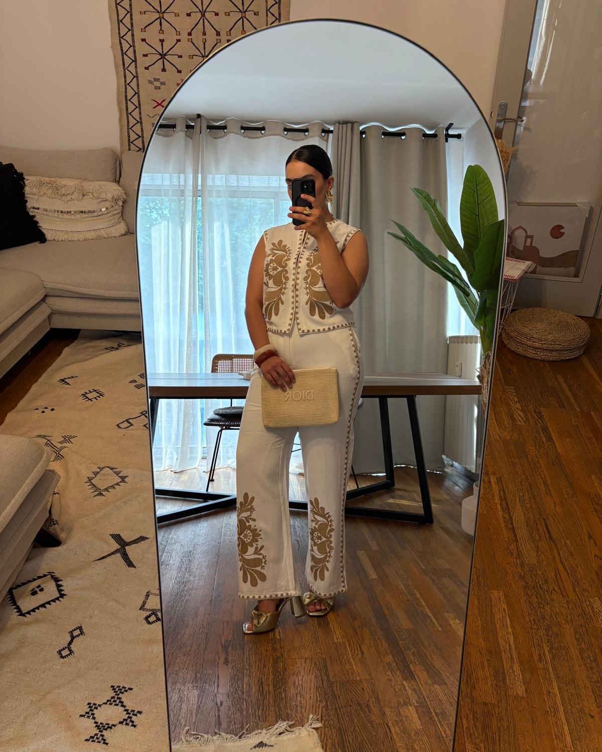 Succombez au charme bohème avec cet ensemble composé d'un gilet sans manches et d'un pantalon blanc, sublimés par de délicates broderies marron au style floral et artisanal.